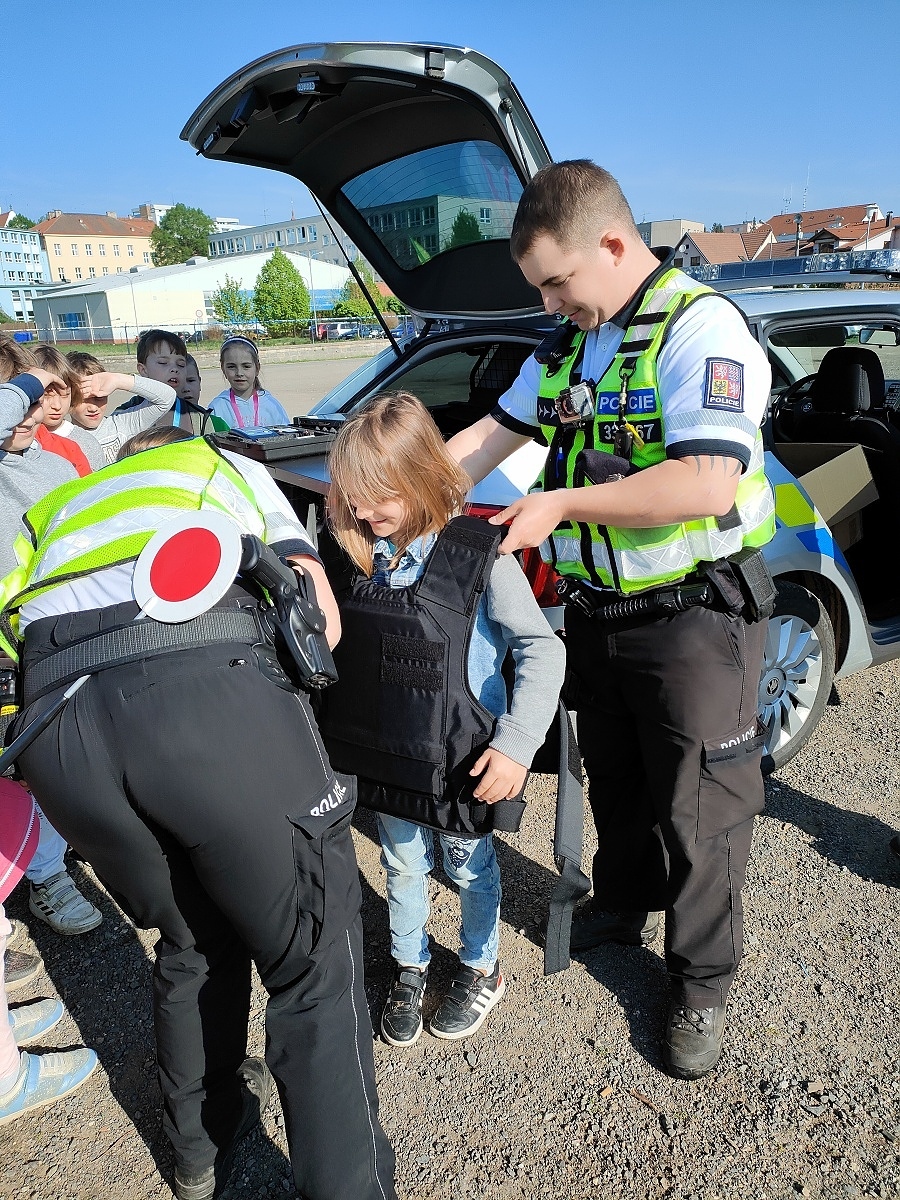 V úterý 10.5. dopoledne naše druhé třídy navštívila Dopravní policie z Příbrami. Byla to přátelská návštěva policistů, která přijela opravdovými policejními vozy i motorkou a předala dětem cenné informace a rady. Žáci měli možnost dozvědět se spoustu zajímavých informací v mnoha oblastech, kterými se strážci zákona zabývají. Velký ohlas měla prohlídka služebního vozidla. Děti si vyzkoušely neprůstřelnou vestu, helmu, pouta, teleskopický obušek. V závěru nechybělo překvapení pro žáky v podobě reflexních pásků a časopisů. Mnohokrát děkujeme policistům za milou a velice poučnou návštěvu.