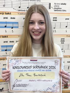 V pátek 6.2.2026 se v Mělníku uskutečnilo krajské kolo v sólovém zpěvu Karlovarský skřivánek. Děti soutěžily v šesti kategoriích  a před velkou konkurencí středočeského kraje předvedly vynikající výkon. Gratulace patří Elle Thee Bartošové, která za výborného klavírního doprovodu spolužáka Ondřeje Dvořáka získala 2. místo !!