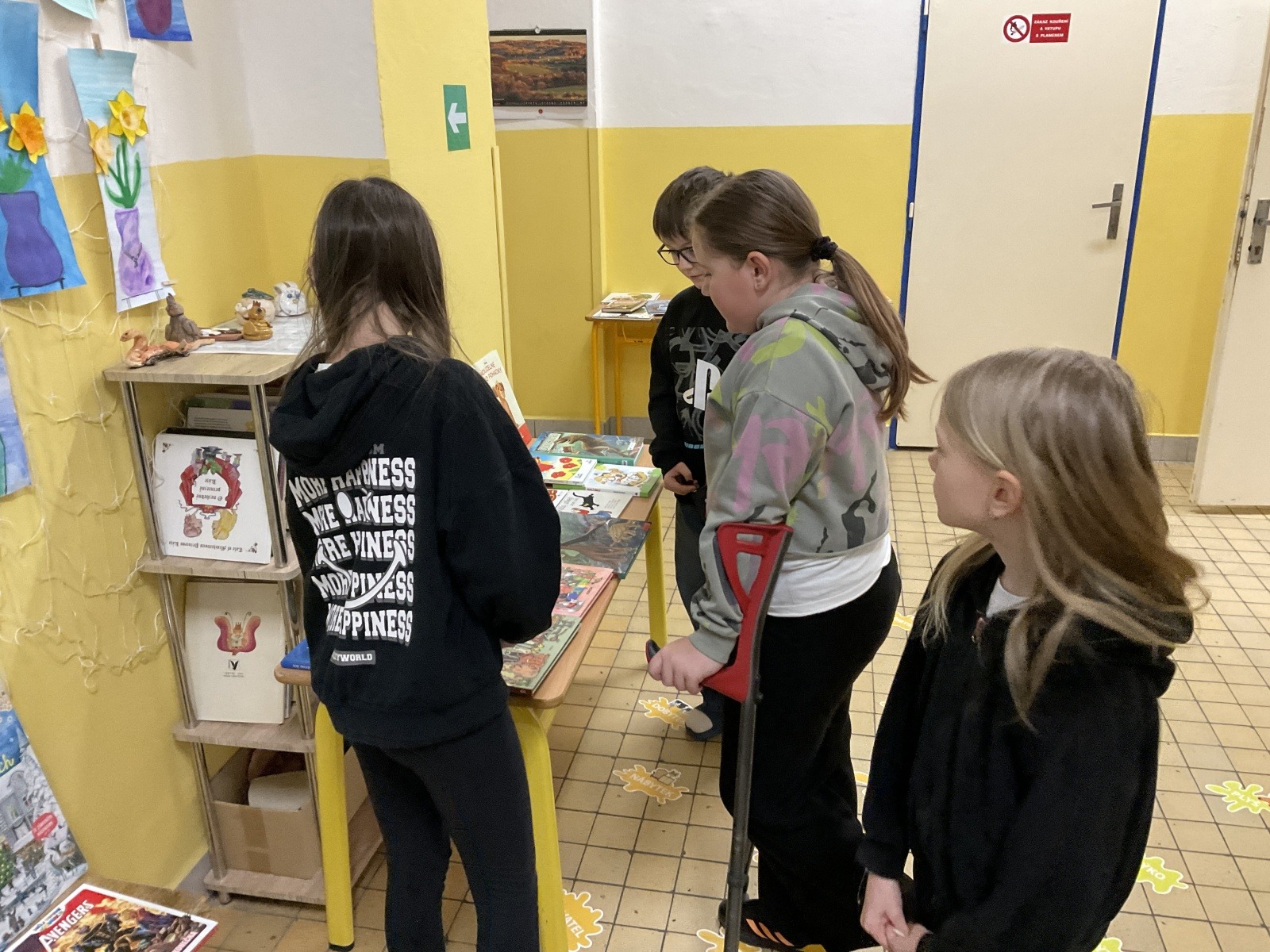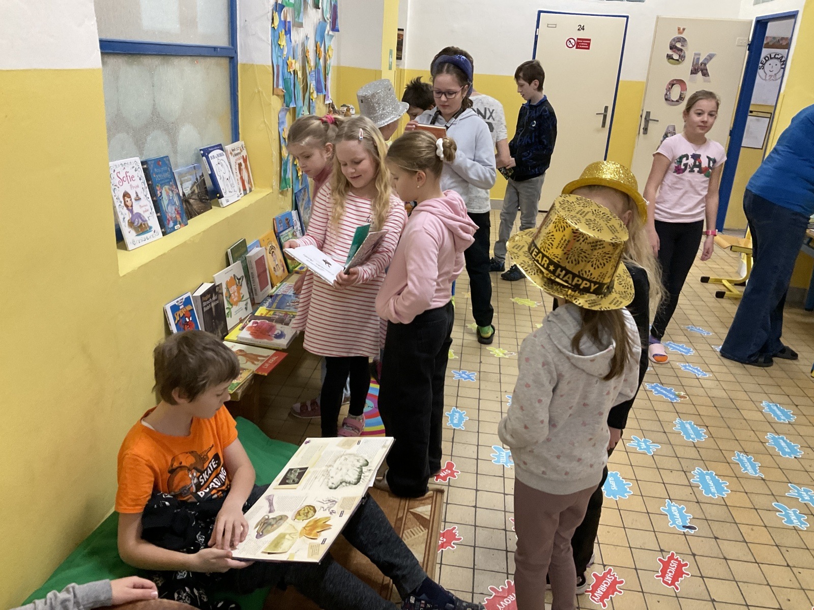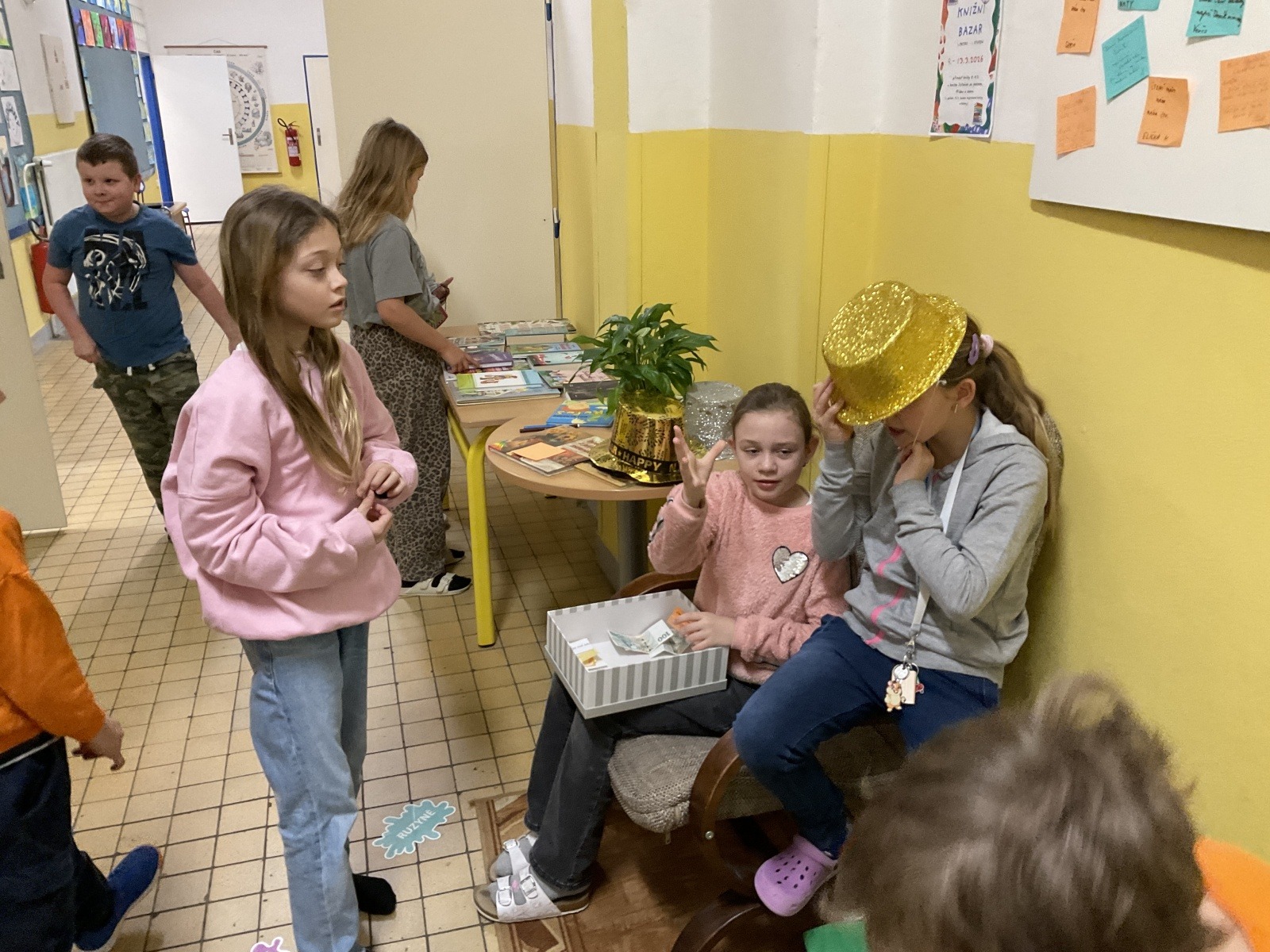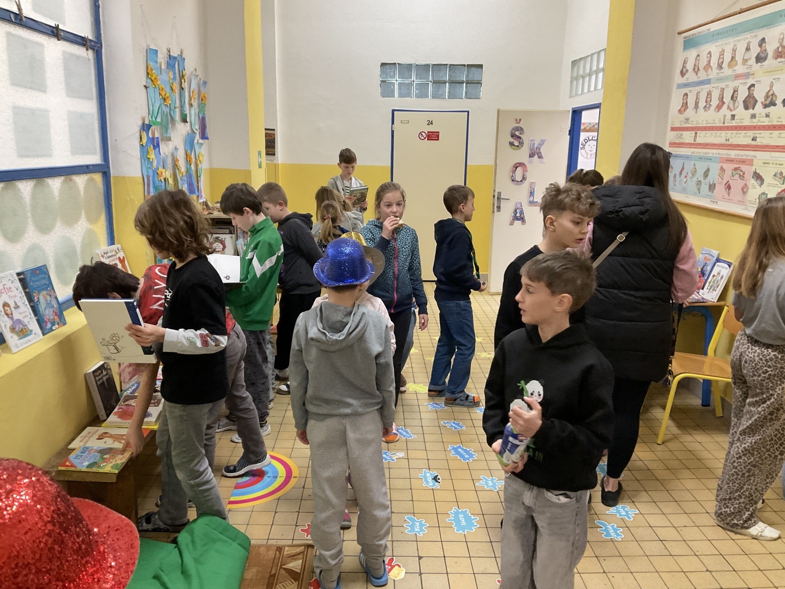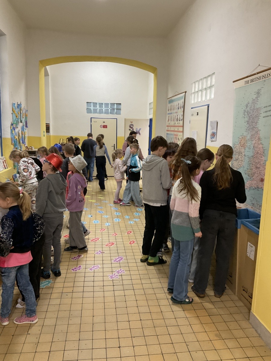 4.B přišla s nápadem uspořádat knižní bazar. Byla to první zkušenost, proto jsme ho nachystali jen v našem patře. Děti přinesly knihy, které už nečtou, a pozvali jsme i spolužáky z jiných tříd, aby přišli vybírat. Celý týden bylo na chodbě živo, děti listovaly, povídaly si o knížkách a nakupovaly. Prodej měla na starost vždy partička složená z dětí ze všech čtyř tříd našeho poschodí.