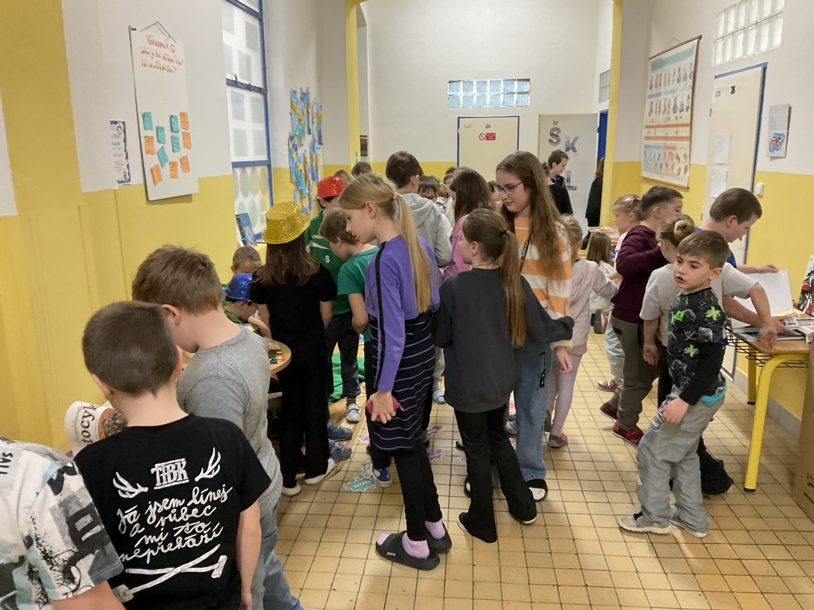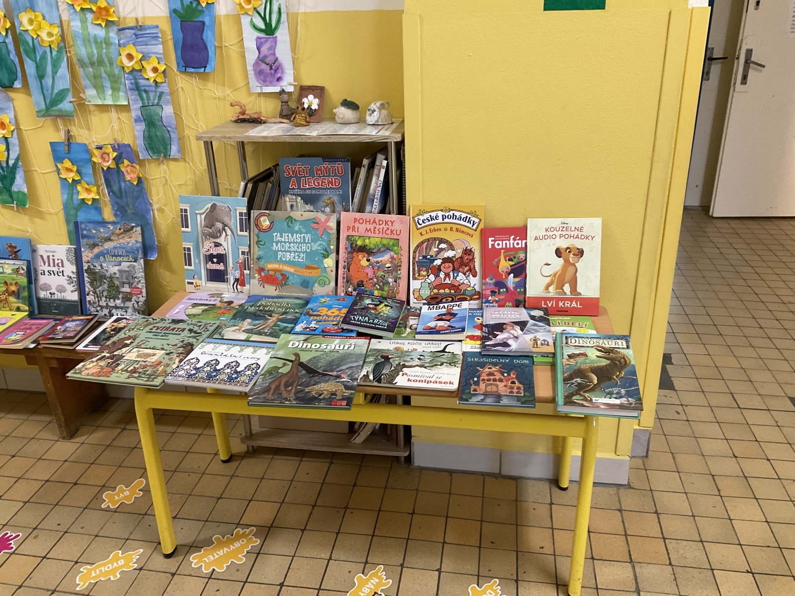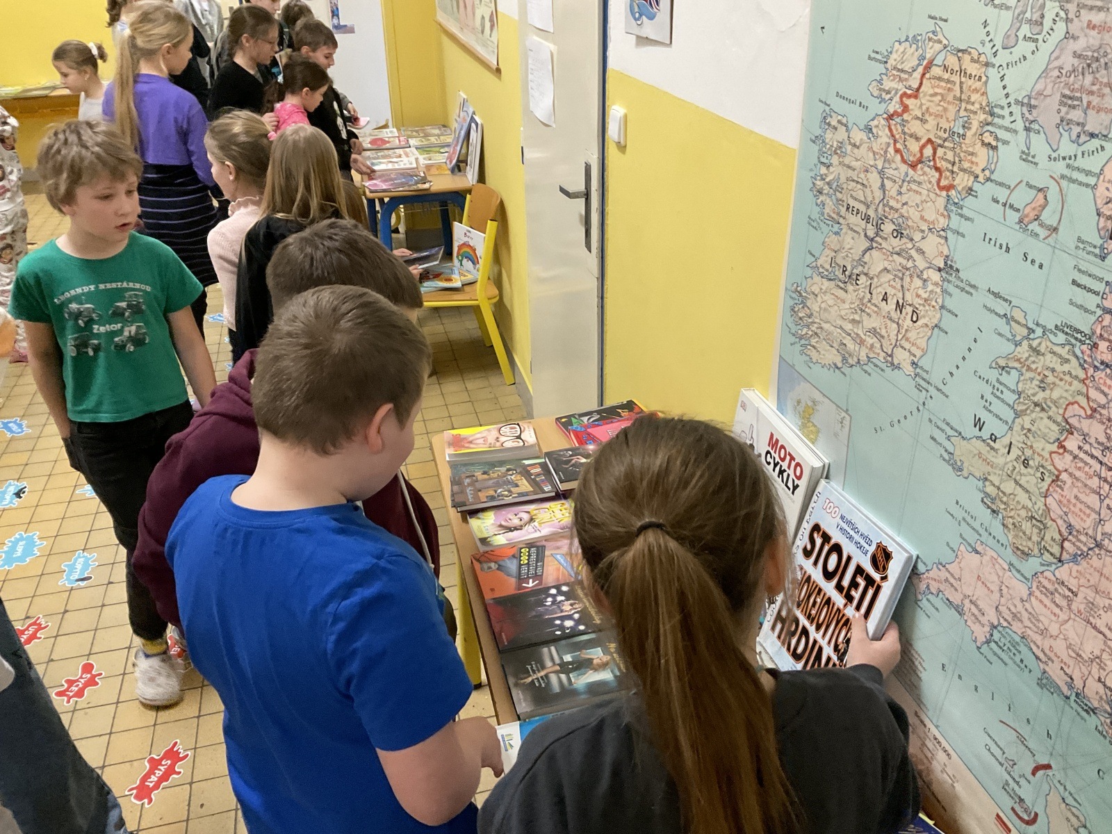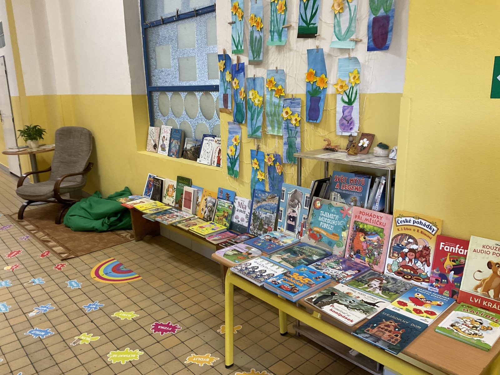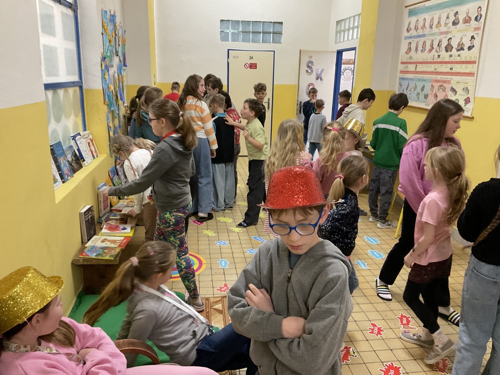 4.B přišla s nápadem uspořádat knižní bazar. Byla to první zkušenost, proto jsme ho nachystali jen v našem patře. Děti přinesly knihy, které už nečtou, a pozvali jsme i spolužáky z jiných tříd, aby přišli vybírat. Celý týden bylo na chodbě živo, děti listovaly, povídaly si o knížkách a nakupovaly. Prodej měla na starost vždy partička složená z dětí ze všech čtyř tříd našeho poschodí.