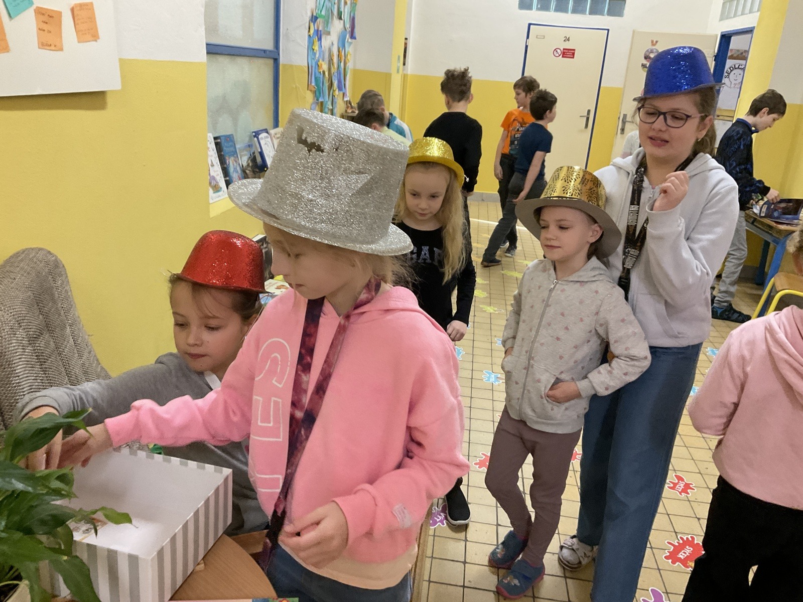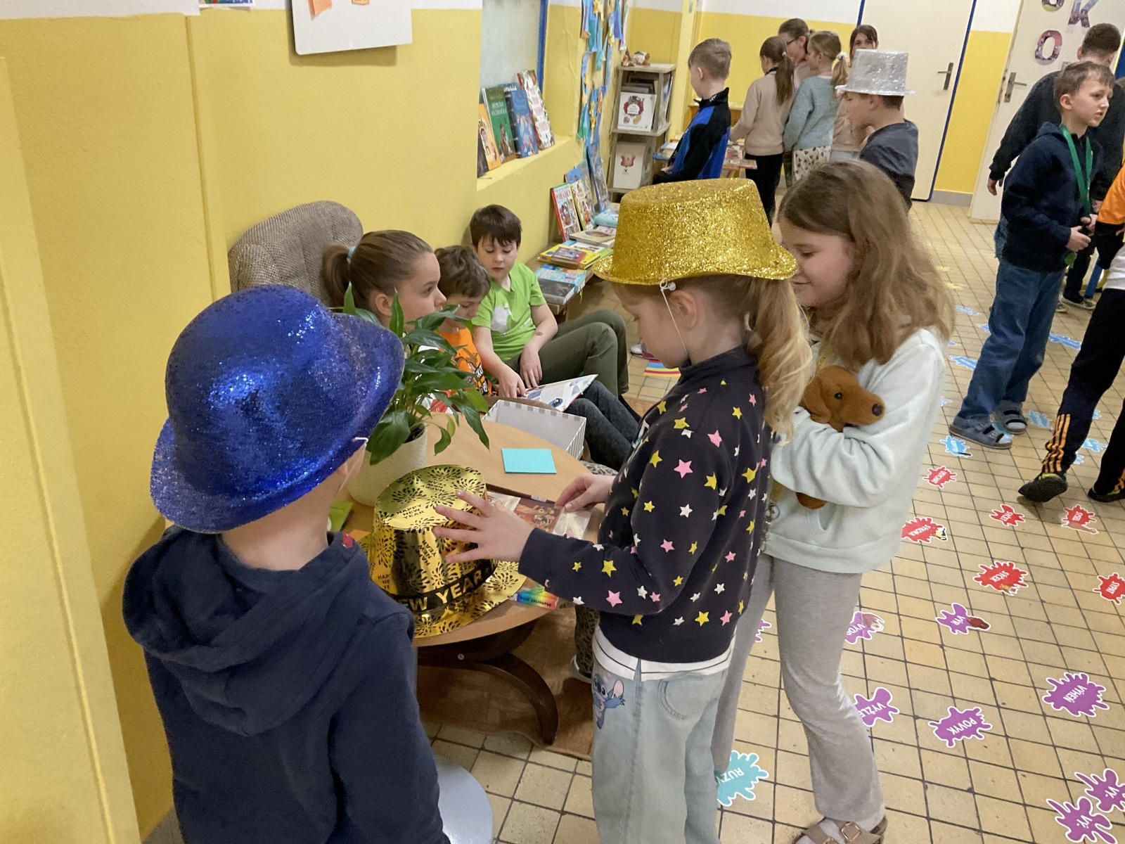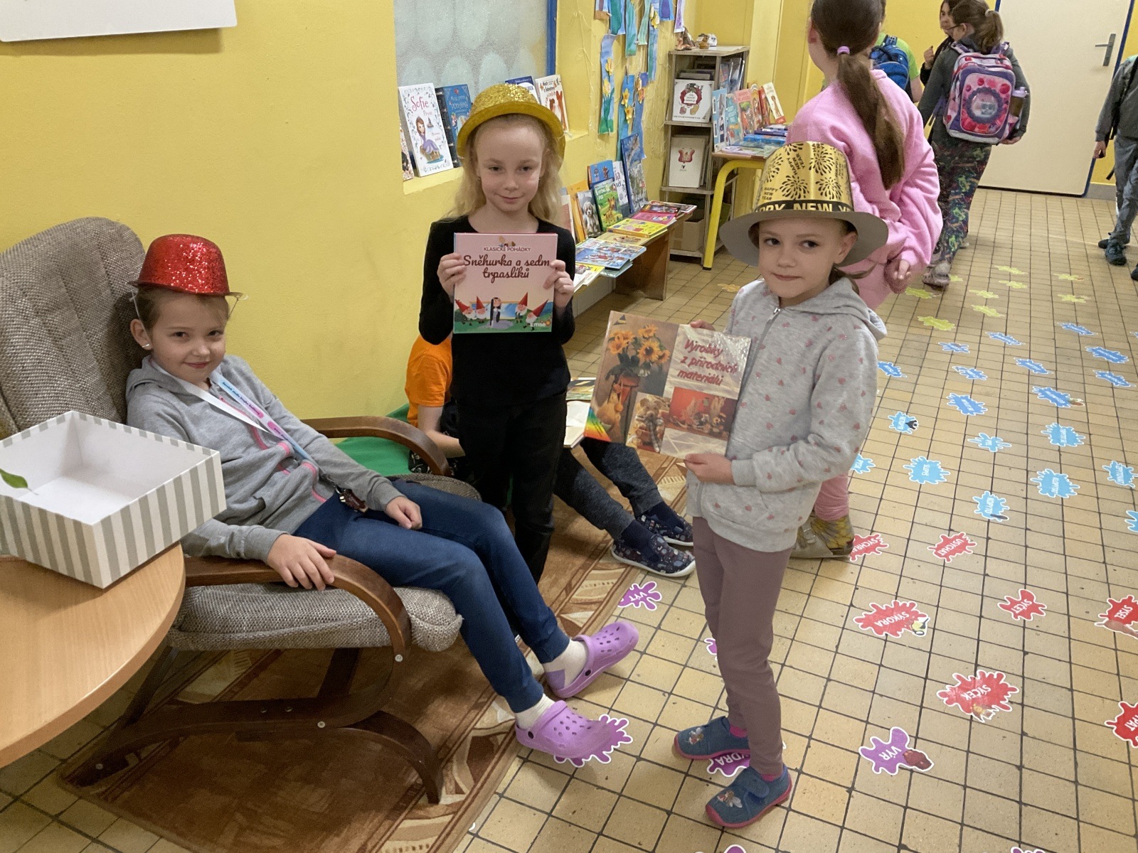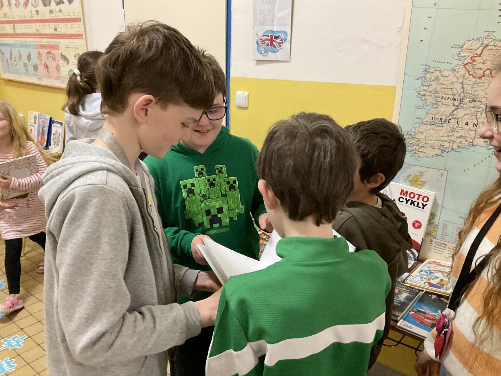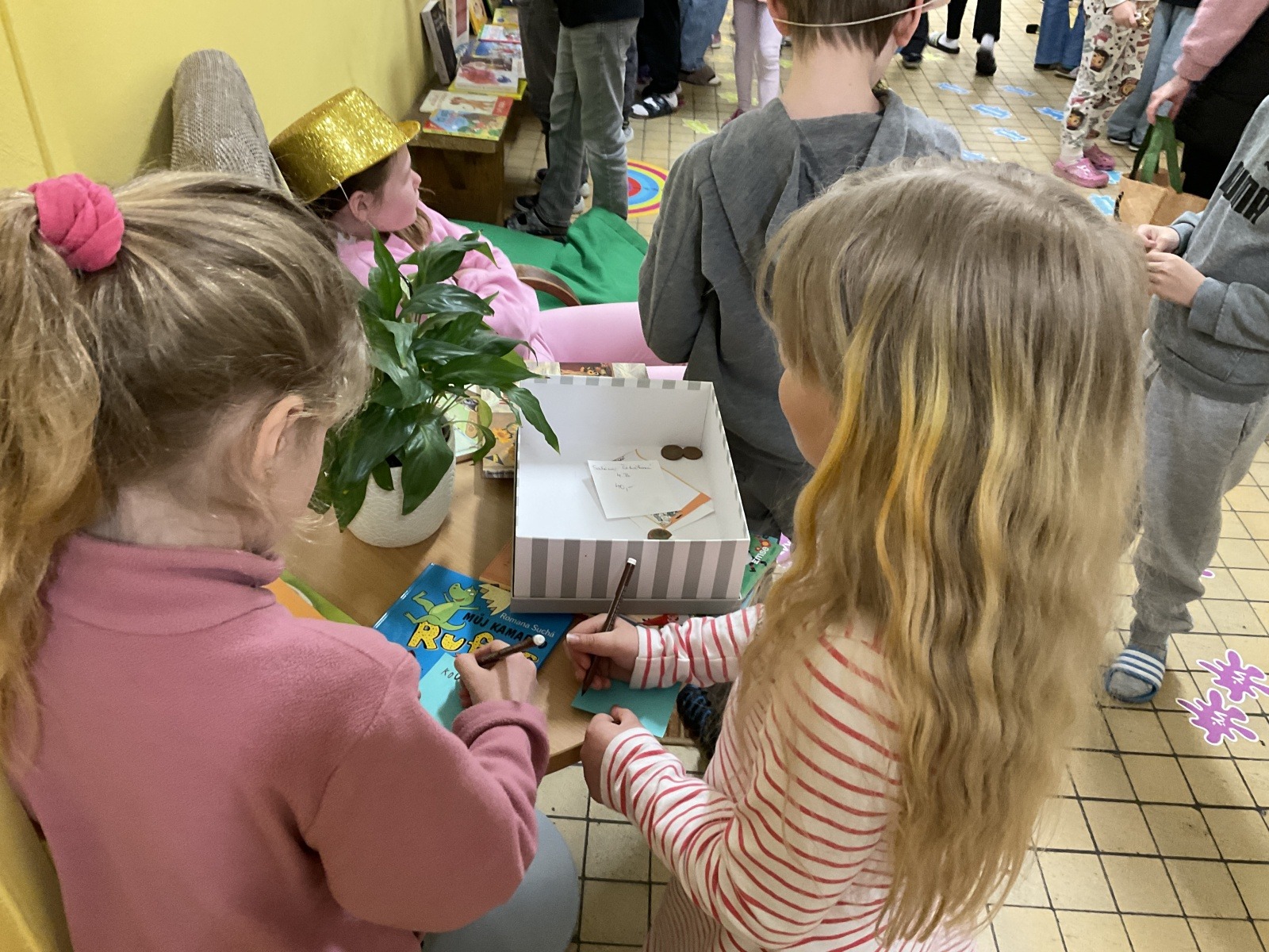 4.B přišla s nápadem uspořádat knižní bazar. Byla to první zkušenost, proto jsme ho nachystali jen v našem patře. Děti přinesly knihy, které už nečtou, a pozvali jsme i spolužáky z jiných tříd, aby přišli vybírat. Celý týden bylo na chodbě živo, děti listovaly, povídaly si o knížkách a nakupovaly. Prodej měla na starost vždy partička složená z dětí ze všech čtyř tříd našeho poschodí.